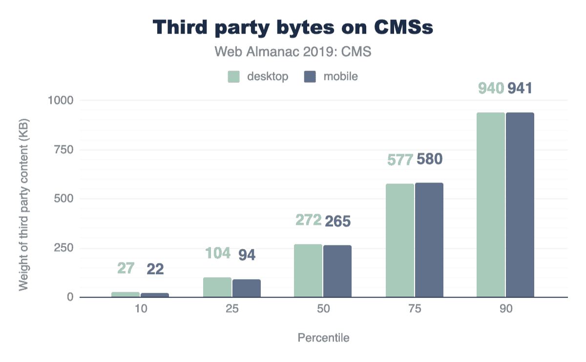 The median amount of 3rd party requests on mobile CMS pages is 15 and weigh 264.72 KB, while the median for these requests on desktop CMS pages is 16 and weigh 271.56 KB. (Note that this excludes 3P resources considered part of “hosting”).