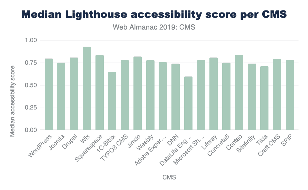 As it stands now, only 1.27% of mobile CMS home pages get a perfect score of 100%. Of the top CMSs, Wix takes the lead by having the highest median accessibility score on its mobile pages. Overall, these figures are dismal when you consider how many websites (how much of the web that is powered by CMSs) are inaccessible to a significant segment of our population. As much as digital experiences impact so many aspects of our lives, this should be a mandate to encourage us to build accessible web experiences from the start, and to continue the work of making the web an inclusive space.