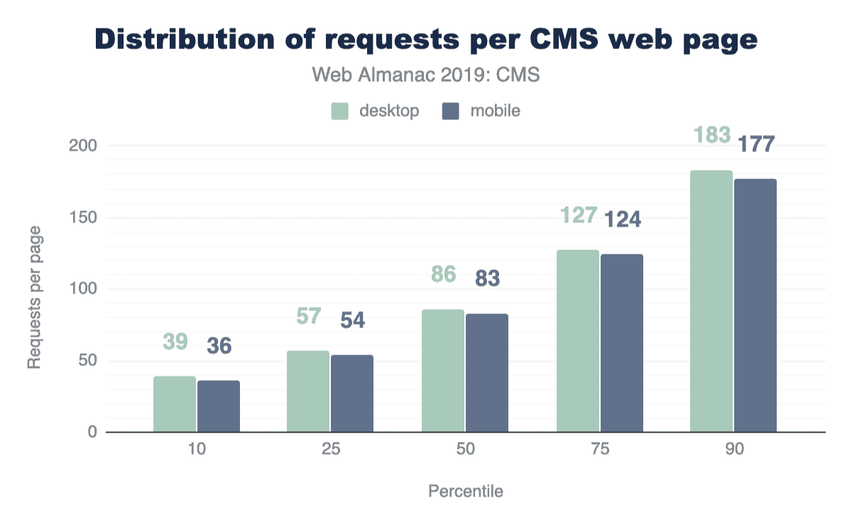 The median indicates the halfway point that all CMS pages either fall above or below. In short, half of all CMS pages load fewer requests and weigh less, while half load more requests and weigh more. At the 10th percentile, mobile and desktop pages have under 40 requests and 1 MB in weight, but at the 90th percentile we see pages with over 170 requests and at 7 MB, almost tripling in weight from the median.