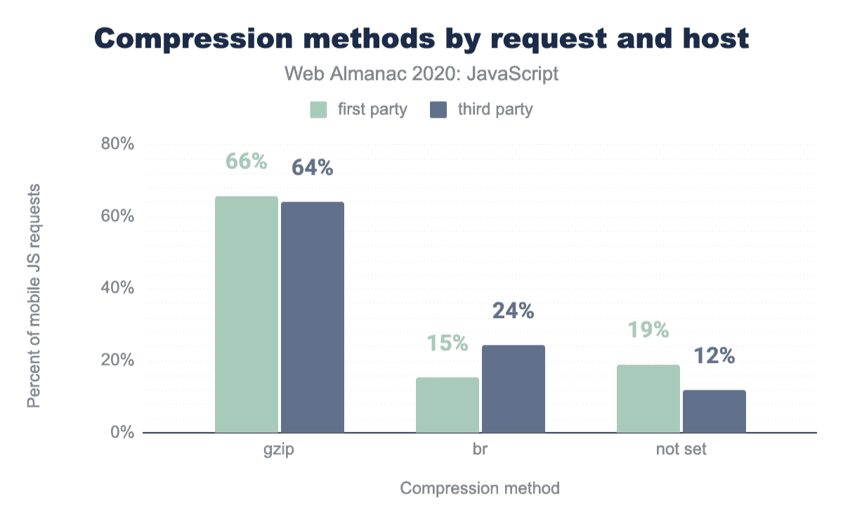Once again, this appears to be an area where third-party scripts are actually doing better than first-party scripts. If we break the compression methods out by first- and third-party, we see that 24% of third-party scripts have Brotli applied, compared to only 15% of first-party scripts.