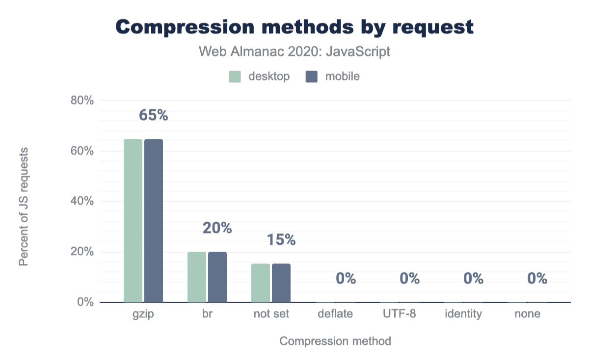 85% of all JavaScript requests have some level of network compression applied. Gzip makes up the majority of that, with 65% of scripts having Gzip compression applied compared to 20% for Brotli (br). While the percentage of Brotli (which is more effective than Gzip) is low compared to its browser support, it’s trending in the right direction, increasing by 5 percentage points in the last year.