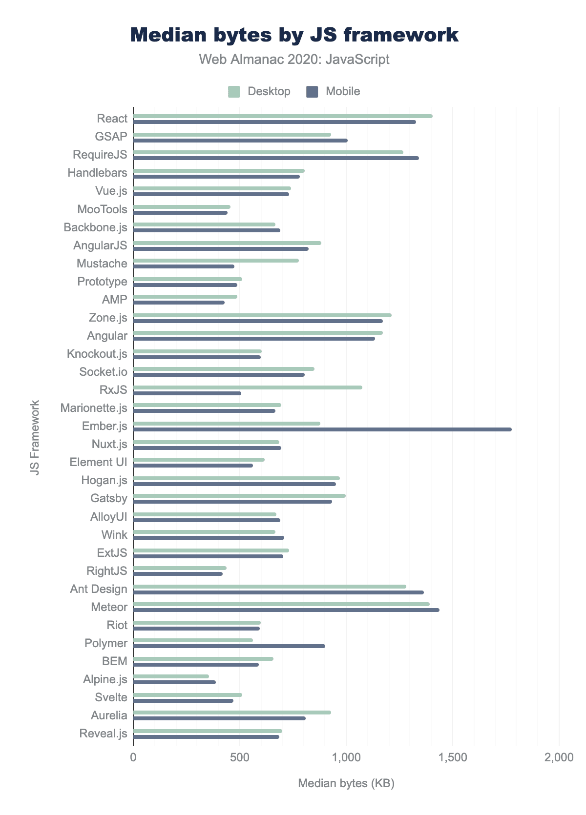 The graph below shows the median bytes for pages where any of the top 35 most commonly detected frameworks were found, broken down by client.