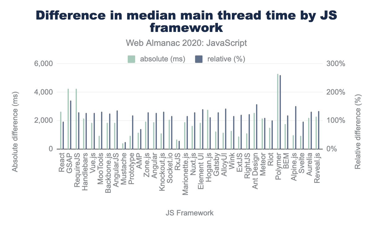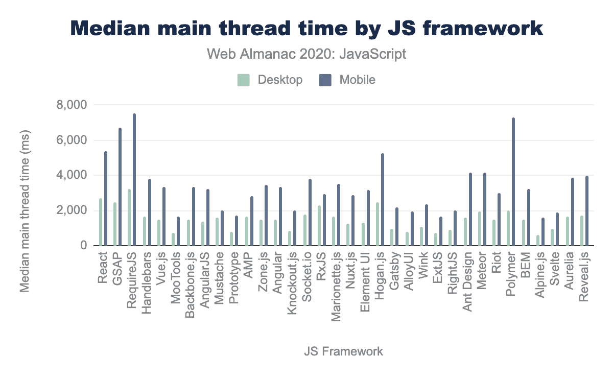 Tools like React, GSAP, and RequireJS tend to spend a lot of time on the main thread of the browser, regardless of whether it’s a desktop or mobile page view. The same tools that tend to lead to less code overall—tools like Alpine and Svelte—also tend to lead to lower impact on the main thread.