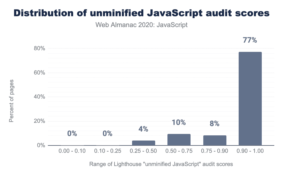 The chart above shows that most pages tested (77%) get a score of 0.90 or above, meaning that few unminified scripts are found.