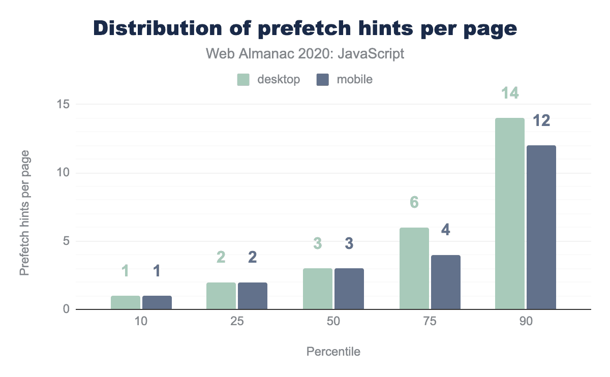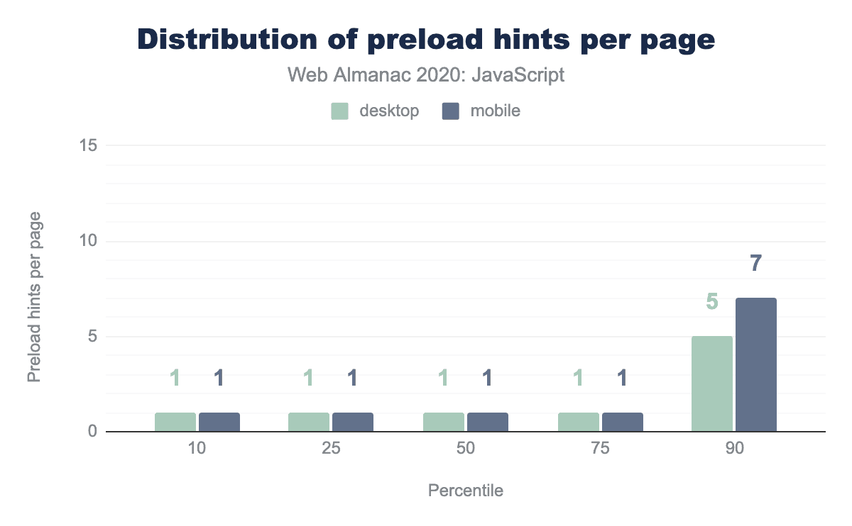 At the median, pages that use a prefetch hint to load JavaScript use three, while pages that use a preload hint only use one. The long tail gets a bit more interesting, with 12 prefetch hints used at the 90th percentile and 7 preload hints used on the 90th as well. For more detail on resource hints, check out this year’s Resource Hints chapter.