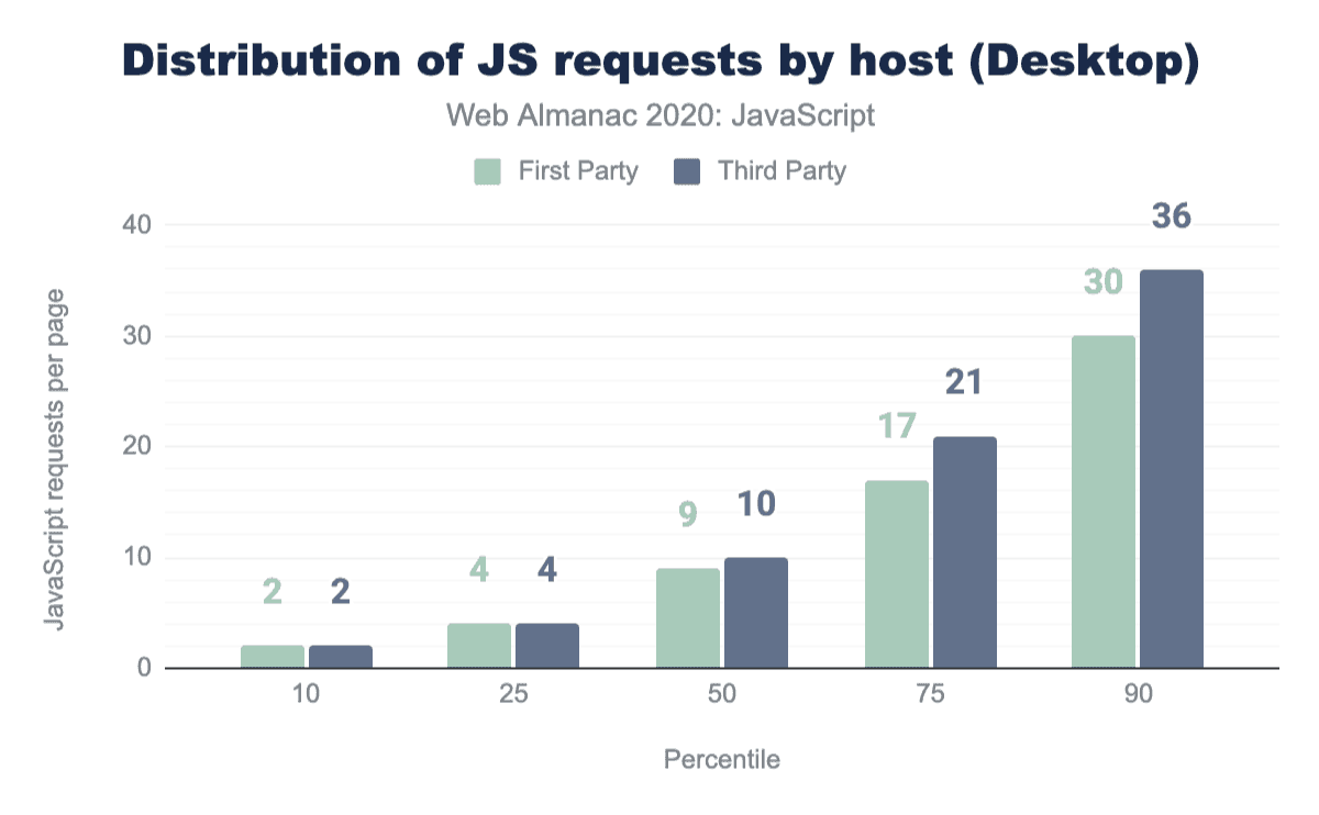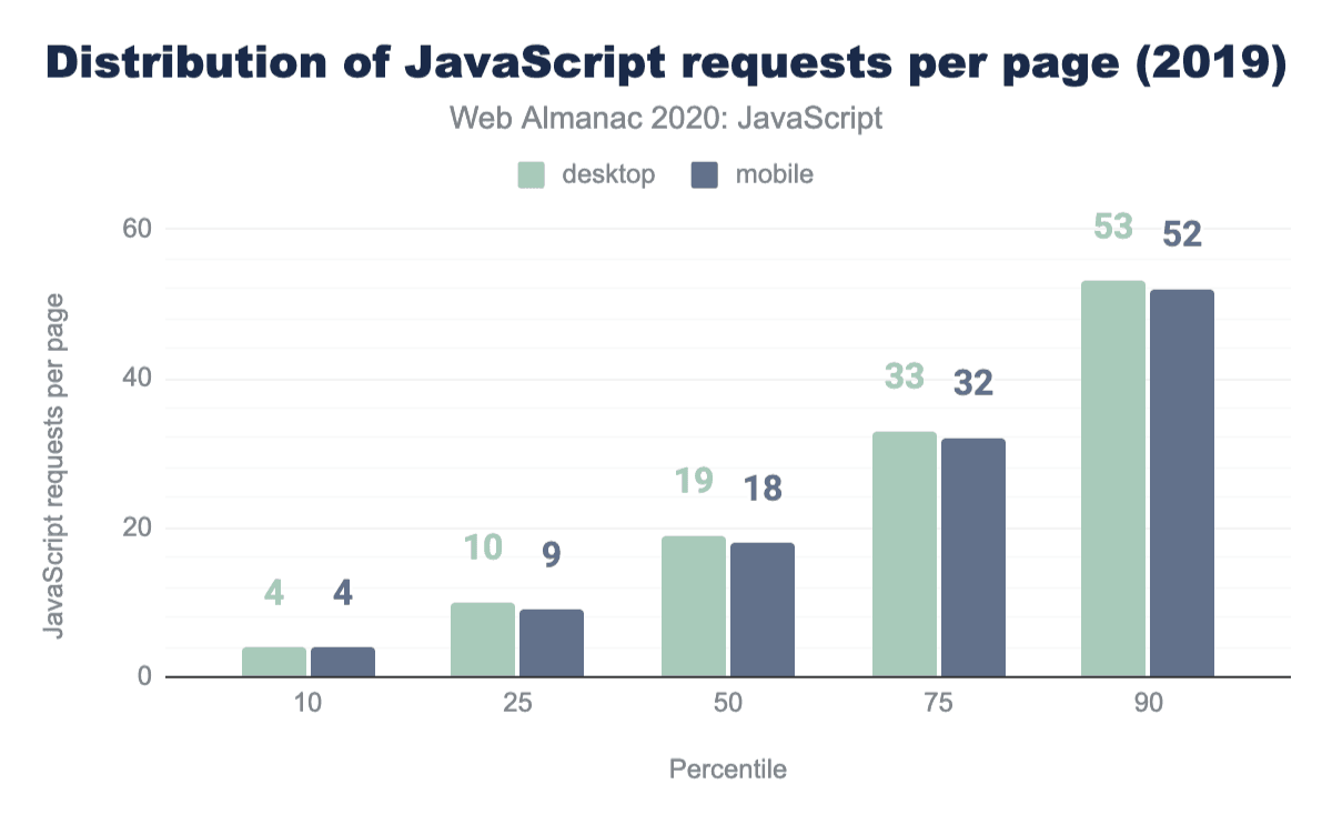 Another way of looking at how much JavaScript we use is to explore how many JavaScript requests are made on each page. While reducing the number of requests was paramount to maintaining good performance with HTTP/1.1, with HTTP/2 the opposite is the case: breaking JavaScript down into smaller, individual files is typically better for performance.