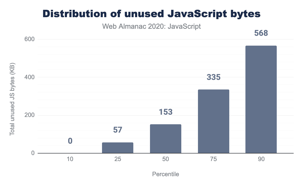 At least some of this weight seems to be unnecessary. If we look at a breakdown of how much of that JavaScript is unused on any given page load, we see that the median page is shipping 152 KB of unused JavaScript. That number jumps to 334 KB at the 75th percentile and 567 KB at the 90th percentile.