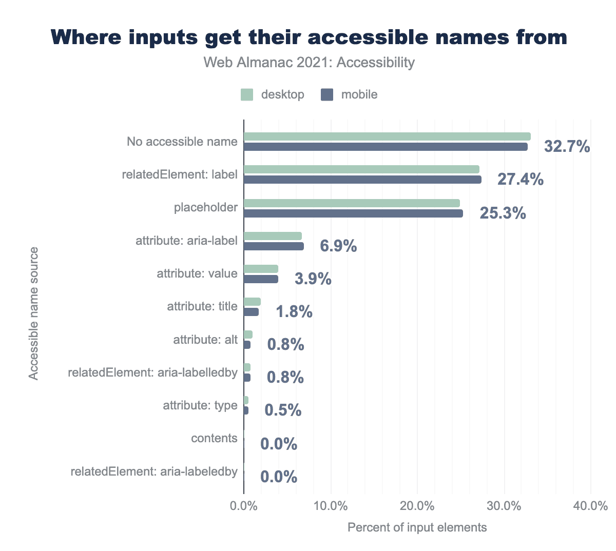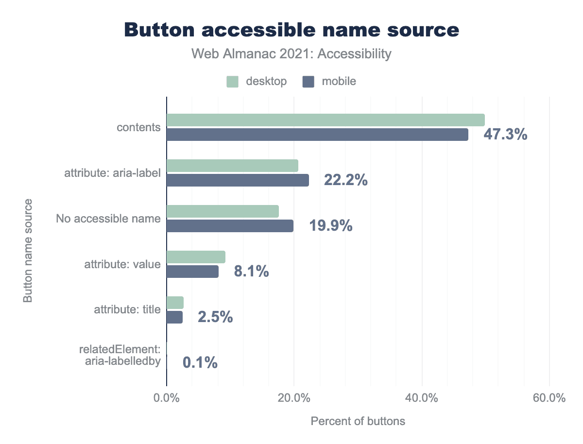 aria-label attribute is used for 20.7% and 22.2% respectively, there is no accessible name for 17.5% and 19.9%, the value attribute is used for 9.2% and 8.1%, title attribute is used for 2.6% and 2.5%, an aria-labelledby related element is used for 0.1% and 0.1%.We found that 57% of buttons on both desktop and mobile sites get their accessible name from content. We also found that 29% of buttons on desktop sites and 27% of buttons on mobile sites get their accessible names from the aria-label attribute.