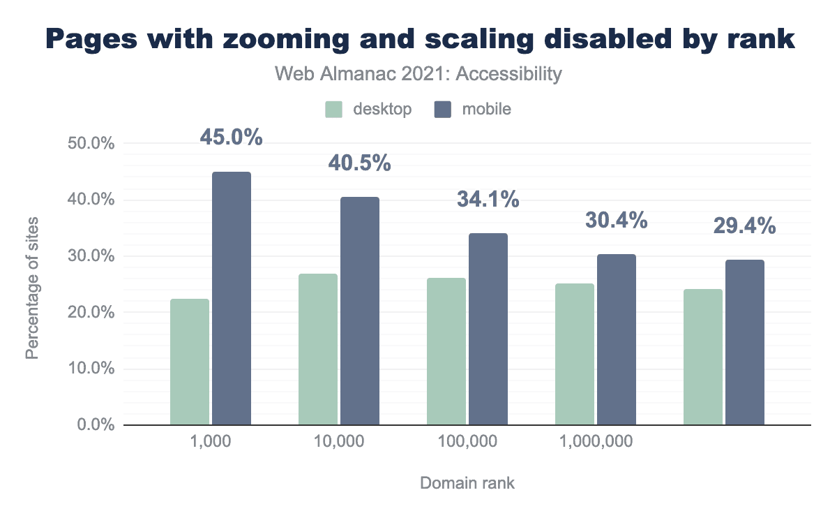 We found that 24% of desktop home pages and 29% of mobile home pages attempt to disable scaling by setting either maximum-scale to a value less than or equal to 1, or user-scalable set to 0 or none.