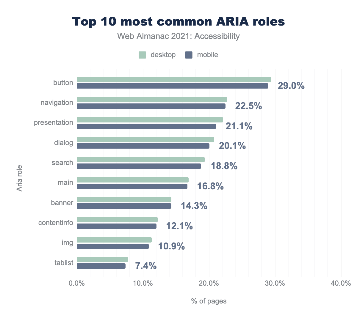 We found that 29% (up from 25% in 2020) of desktop sites and 29% of mobile sites (up from 25% in 2020) had home pages with at least one element with an explicitly assigned role="button". This suggests that close to a third of websites are using the button role on elements in order to change their semantics, with the exception of buttons that have been explicitly assigned the button role, which is redundant.
