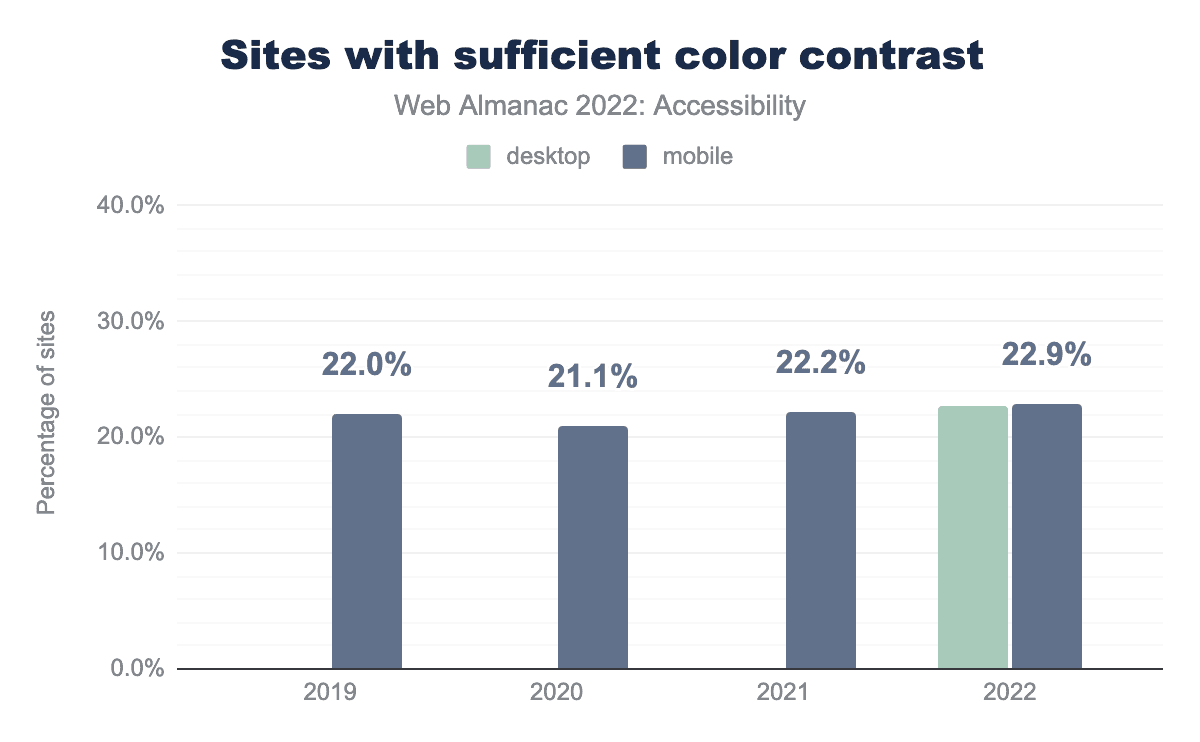 We found that 22.9% of mobile sites have sufficient text color contrast, which is less than a 1% increase from last year. In 2022, we also have data for desktop sites, with 22.7% passing automated text contrast checks. The color contrast issue—at least for the text-based color contrasts that we tested—is pretty straightforward to validate even before you start building the website. There are multiple tools that can help developers and designers to check color contrast of text and graphical elements such as: