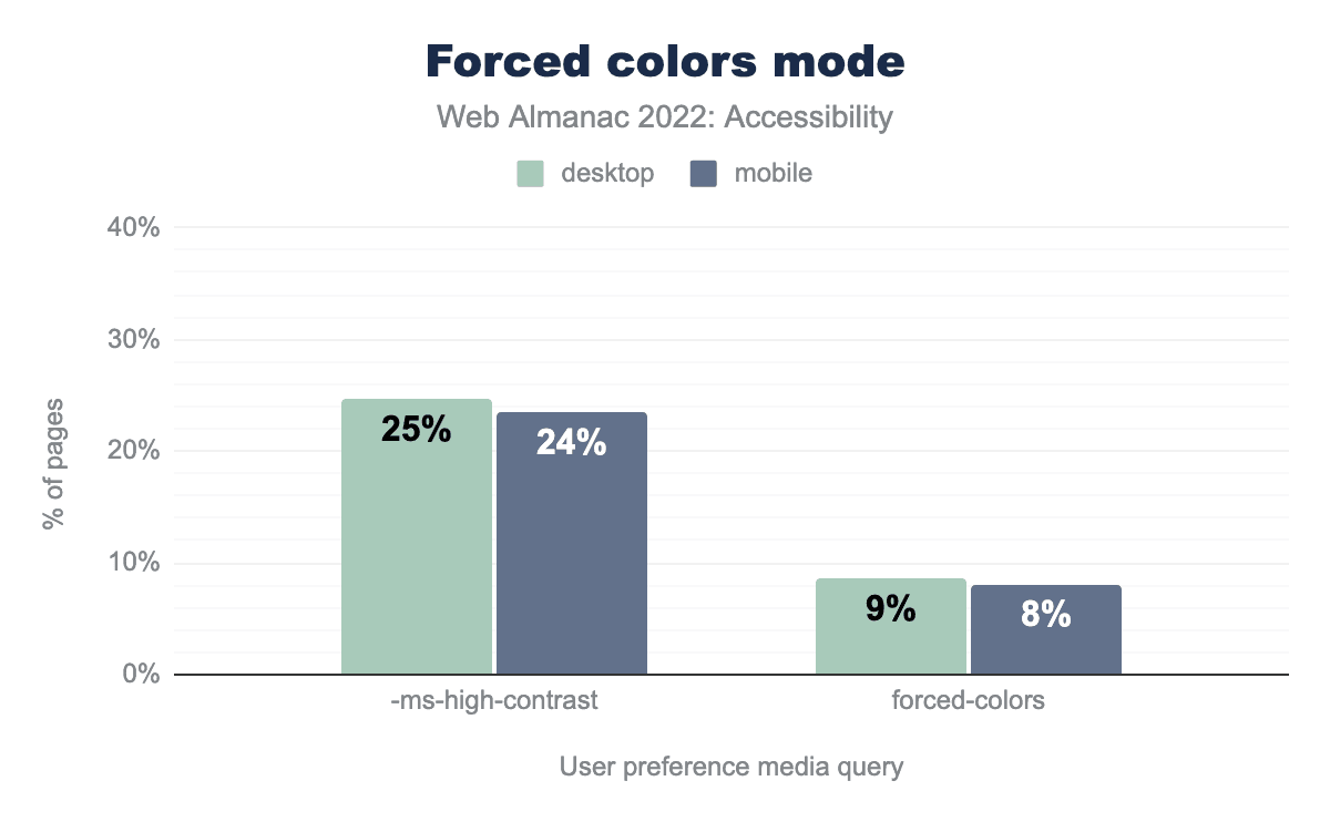 Like other user preference media queries, we see a lot of websites making adjustments based on forced colors mode. 8% of mobile sites and 9% of desktop sites use the forced-colors media query to alter their styles, while usage of the legacy IE11-only -ms-high-contrast media query is above 20% for both mobile and desktop. This doesn’t tell us to what extent sites do support forced colors mode, but the data is encouraging nonetheless considering the forced-colors media query has only been supported in major browsers since 2020, and support for emulating forced-colors mode on devices other than Windows is only available since February 2022.