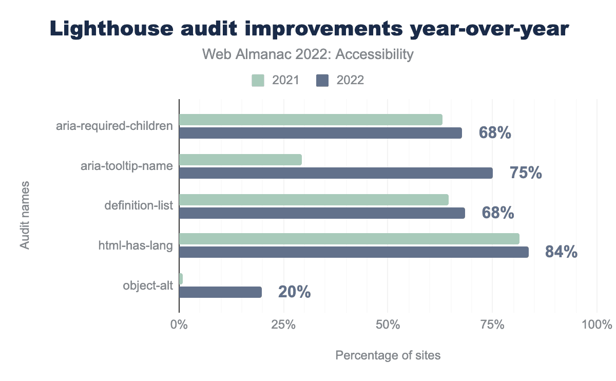 Looking at Lighthouse audits reporting results, out of 41 automated checks, 35 passed successfully on more sites in 2022 compared to 2021. 11 audits show improvements greater than 1%, with aria-required-children, aria-tooltip-name, definition-list, html-has-lang, and object-alt showing the most noteworthy increases. We hope that this increase represents a shift in the right direction.