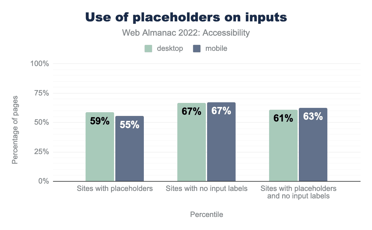 We found that 60% of mobile websites and 62% of desktop websites use tabindex. The tabindex attribute can be used for a few different purposes, which may or may not cause accessibility issues: