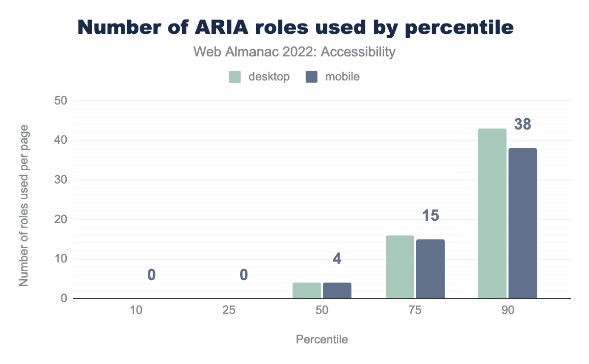Currently 72% of desktop pages have at least one instance of an ARIA role attribute. The median site has four instances of the role attribute.