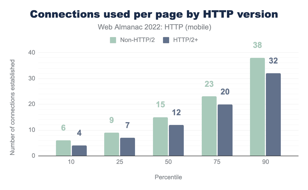 The figure above shows that the median mobile page has 12 connections established during the page load when HTTP/2 is enabled. In contrast, the median page without HTTP/2 has 15 connections established—an overhead of 3 additional connections. However, the overhead worsens at higher percentiles. The page at the 90th percentile with HTTP/2 enabled has 32 connections, whereas the 90th percentile page without HTTP/2 enabled has 38 connections—a 6 additional connection overhead. These trends are the same between desktop and mobile versions of websites.