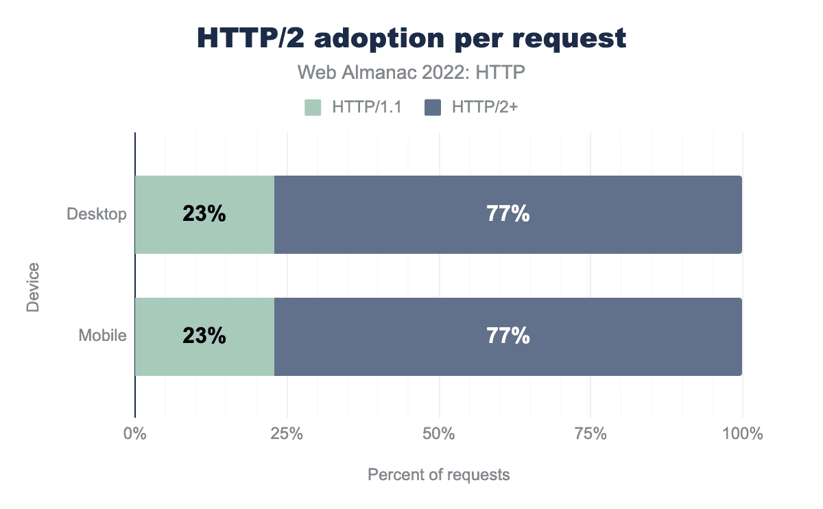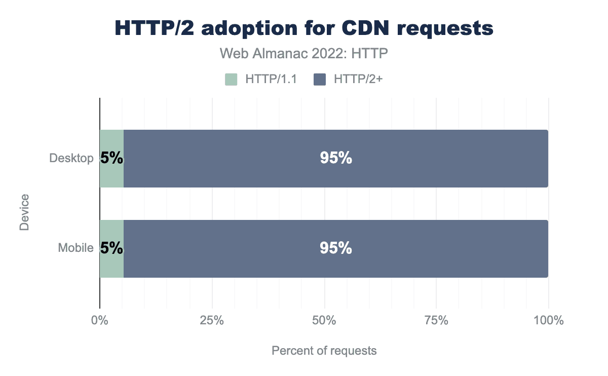 Figure 23.3. Adoption of HTTP/2 and above as a percentage of requests served from a CDN.