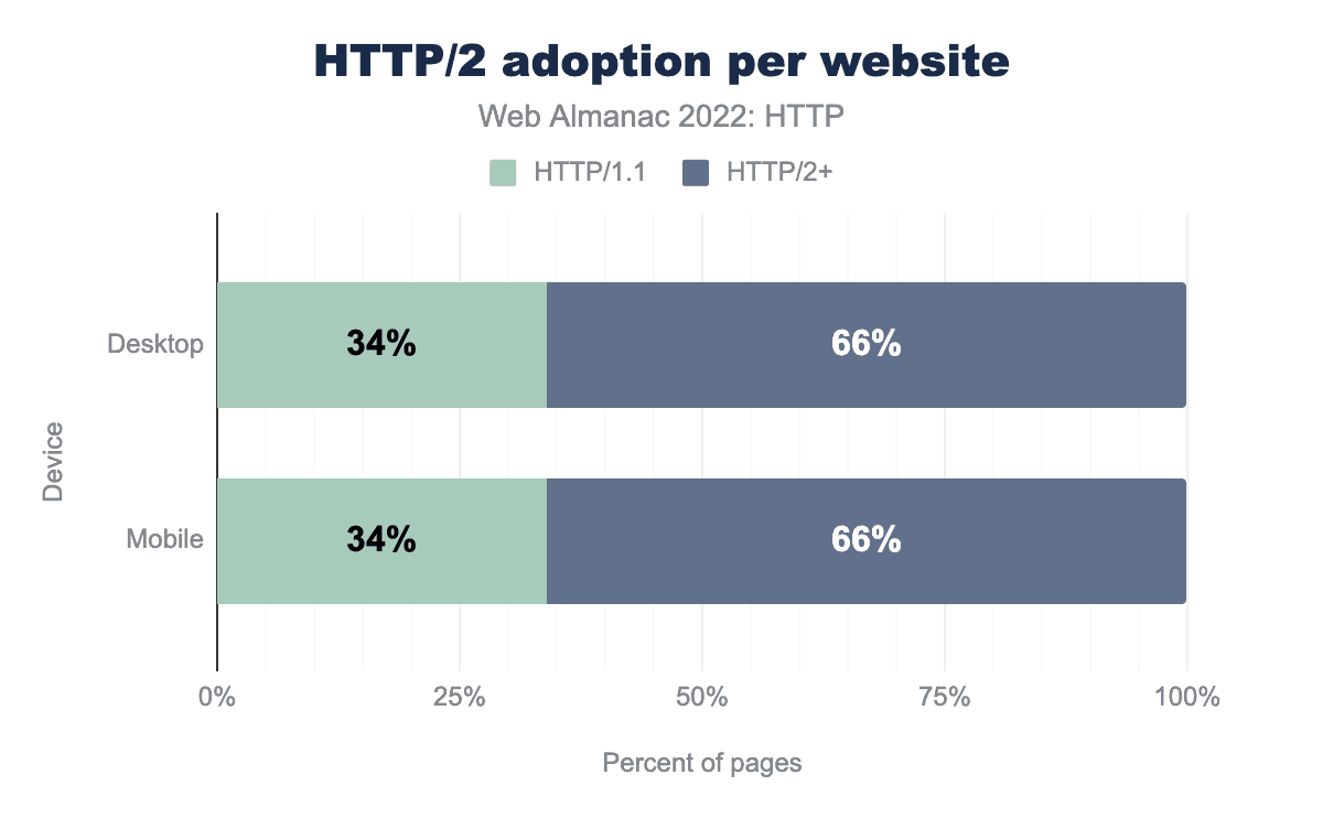 With various HTTP versions introduced over the years, we begin by describing the current state of HTTP version adoption. We measure the HTTP version usage by taking all resources in the 2022 Web Almanac dataset and identify which version of HTTP each resource was served on.