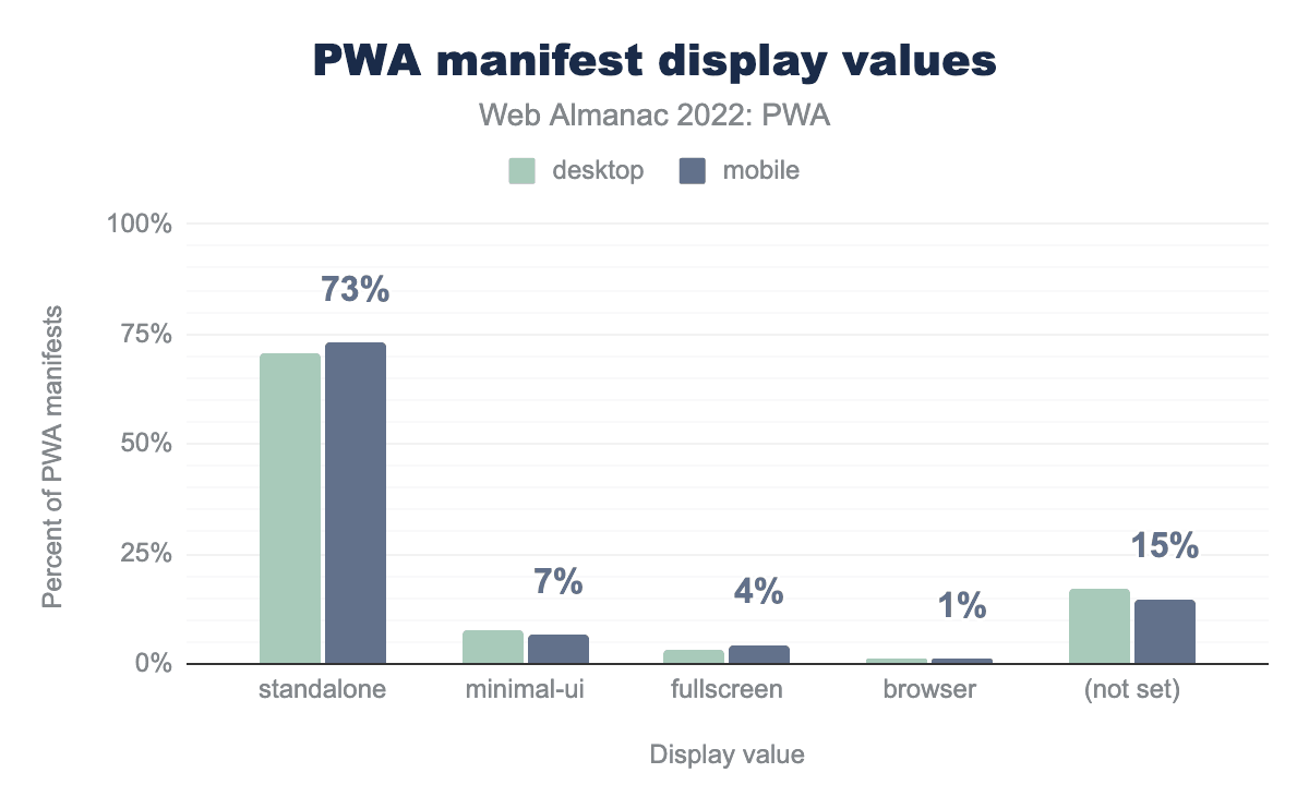 display: standalone mode is the most common display mode, used by almost 3/4 of websites that define a display mode. It’s also one of the display modes that enables an app to be installable.