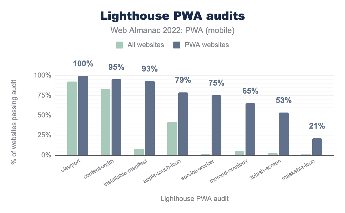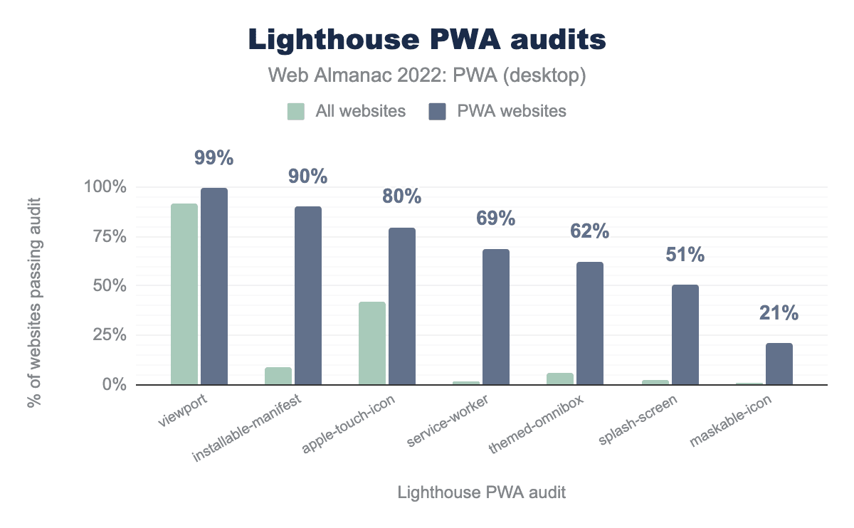 It is not surprising to see PWA sites passing the PWA audits much more frequently than the general web, though some audits such as the presence of a viewport meta tag and the apple-touch-icon meta tag are also often applicable—and used–by non-PWA sites.