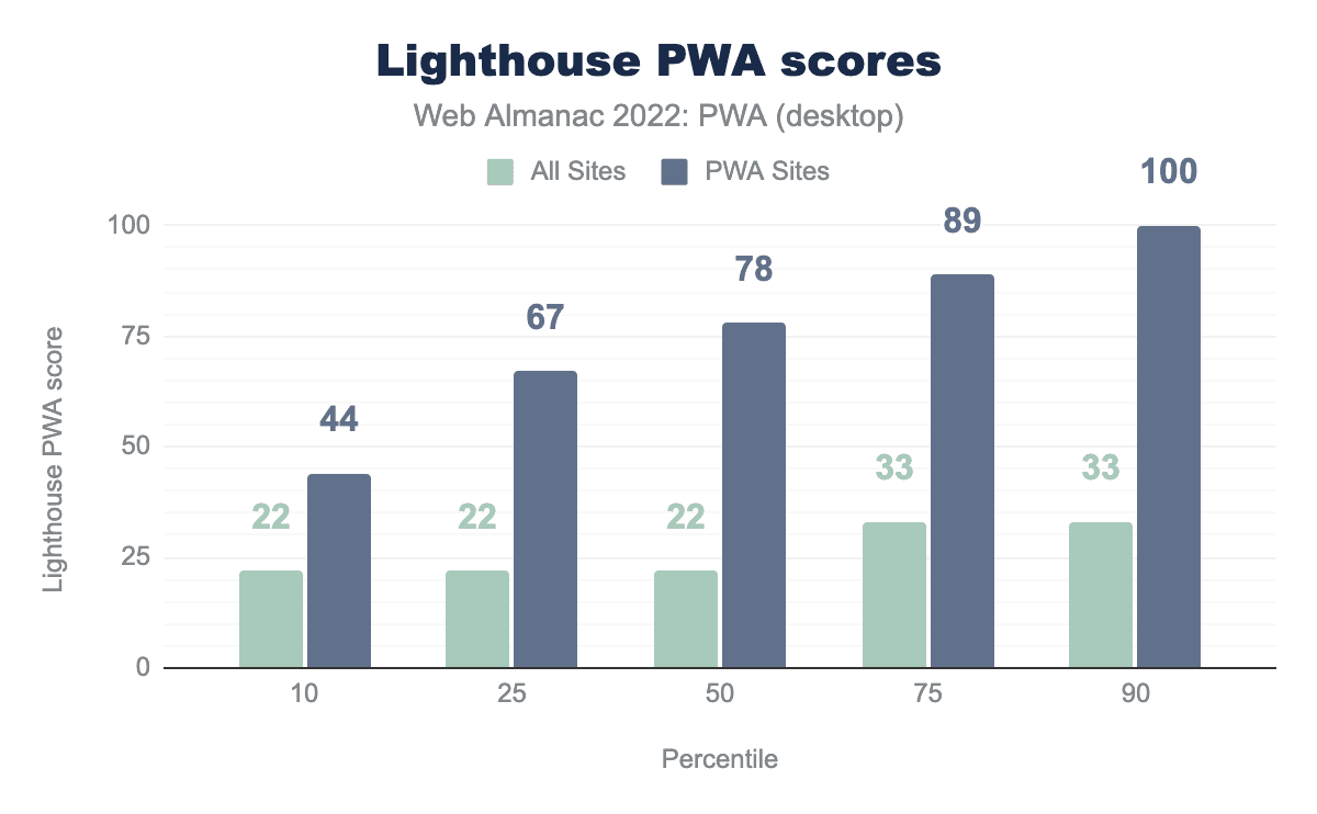 Lighthouse is an open-source, automated tool for improving the quality of web pages. It can be used to run a number of audits on a website and has a dedicated category for PWA audits. The available data sheds some light on interesting facts about the state of PWAs these past 12 months.