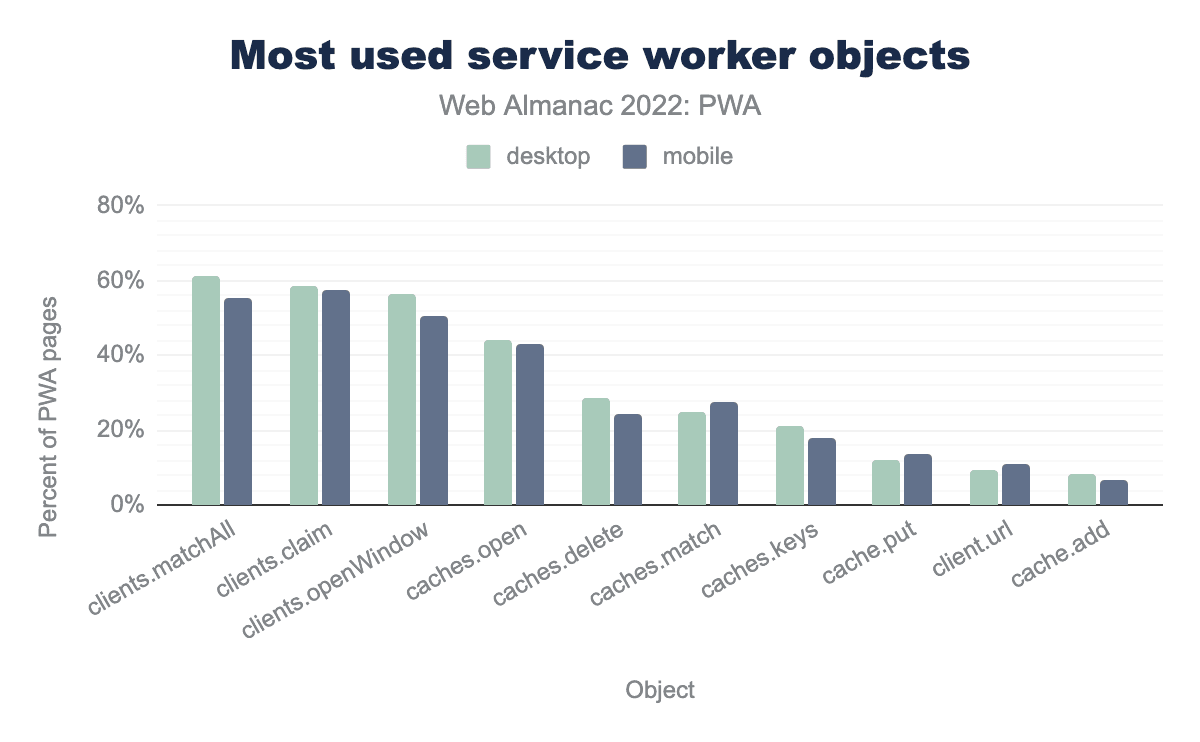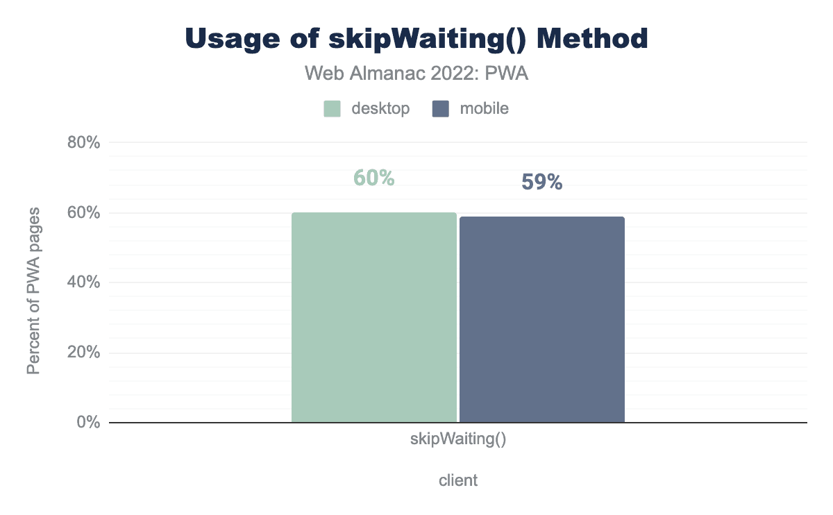 Similar to the stats of last year, the skipWaiting method that is used to immediately activate the service worker is still very popular among developers, being present on 60% of desktop and 59% of mobile web apps.