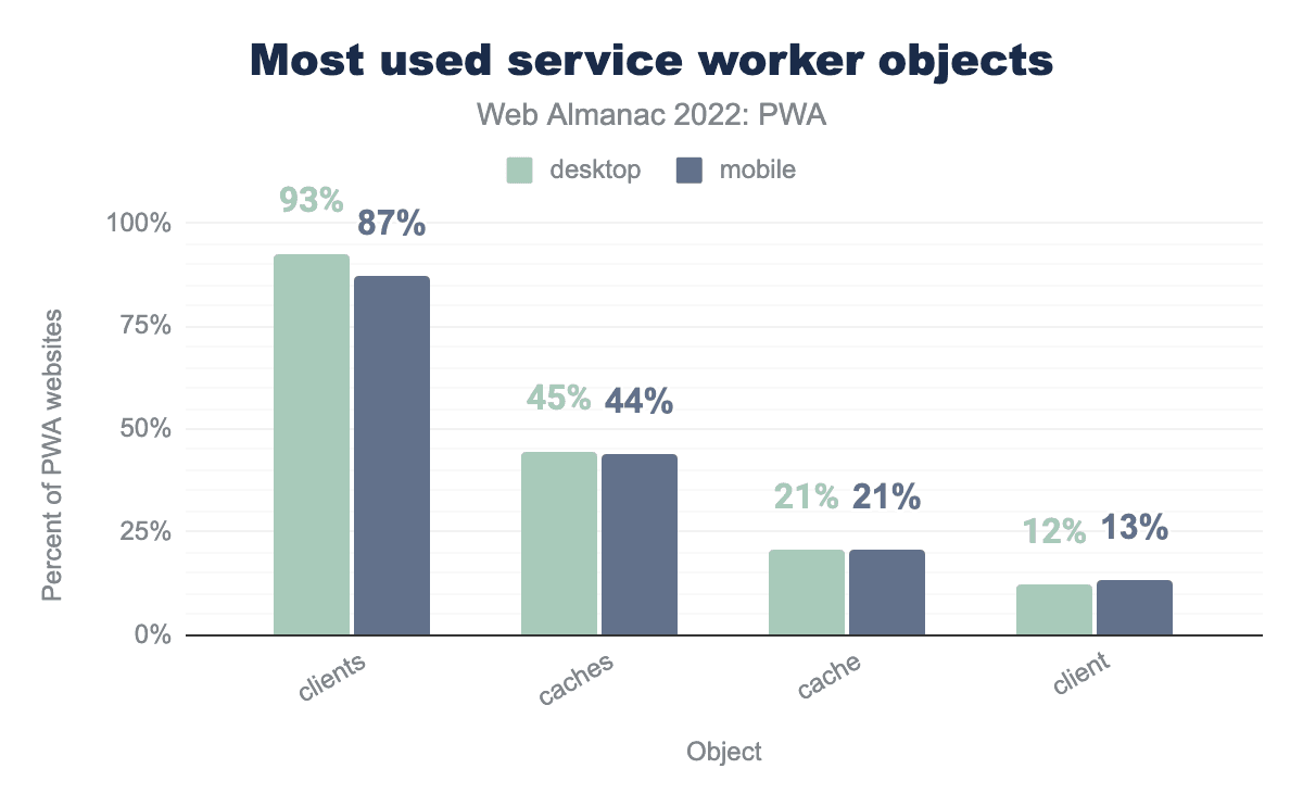 • fetch, which occurs when a request is sent to the server, can be used to intercept said request and respond with custom or cached assets, enabling offline support for our PWAs. Fetch usage is 49% on desktop and 50% on mobile.
