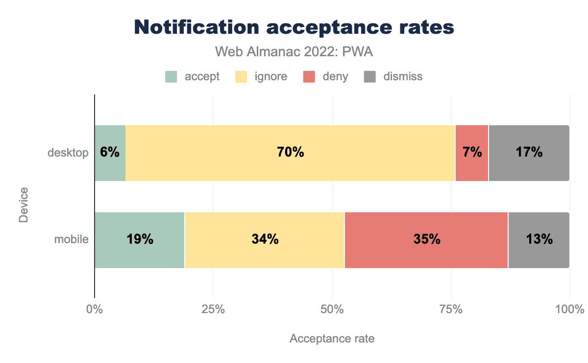 With the growth of notification support and the UX improvements in different platforms, there hasn’t been any major changes in the acceptance of notifications. Since early 2020 they have been around the 6% acceptance rate on desktop and 20% on mobile.