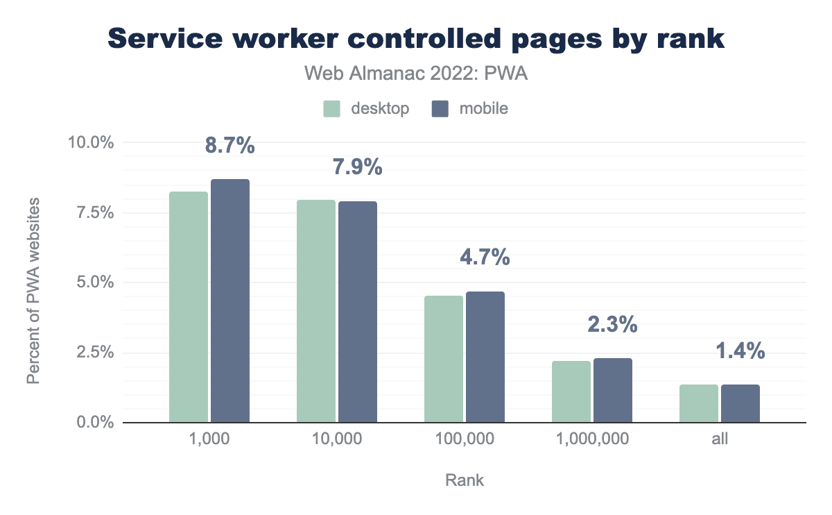 2022 has been a stellar year for PWAs. The increasing features that allow integration of installable web applications with desktop platforms has driven adoption of the technology by big names in the industry. This past year advanced capabilities like protocol handlers, window controls overlay, run on OS login, and more have started to position PWAs as a key technology for application development. Whilst encouraging, this is not representative of the totality of the web platform. service worker usage percentage fell to around half, compared to the data from 2021, but the rise of big applications constructed using PWA technology rose.