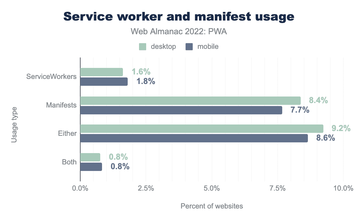 Only a small percentage of websites—0.8% on both desktop and mobile—implement both service worker and manifest files, which means less than 1% of websites can be installed on devices like traditional apps.