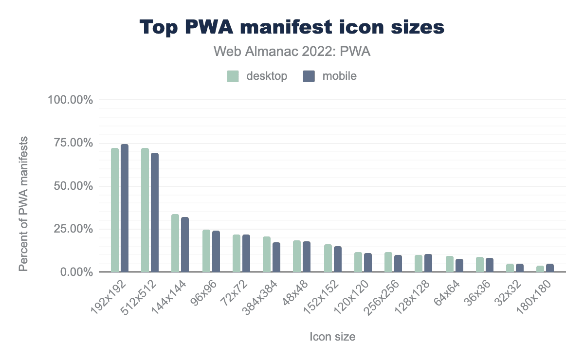 PWAs need to generate different icon sizes to accommodate the range of surfaces where the app can be advertised and placed. Many tools exist to generate the plethora of icons needed for different desktop and mobile environments. The 2 most common icon sizes present in manifest files are 192x192 and 512x512. Both sizes appear in around 70% of the manifest files analyzed.