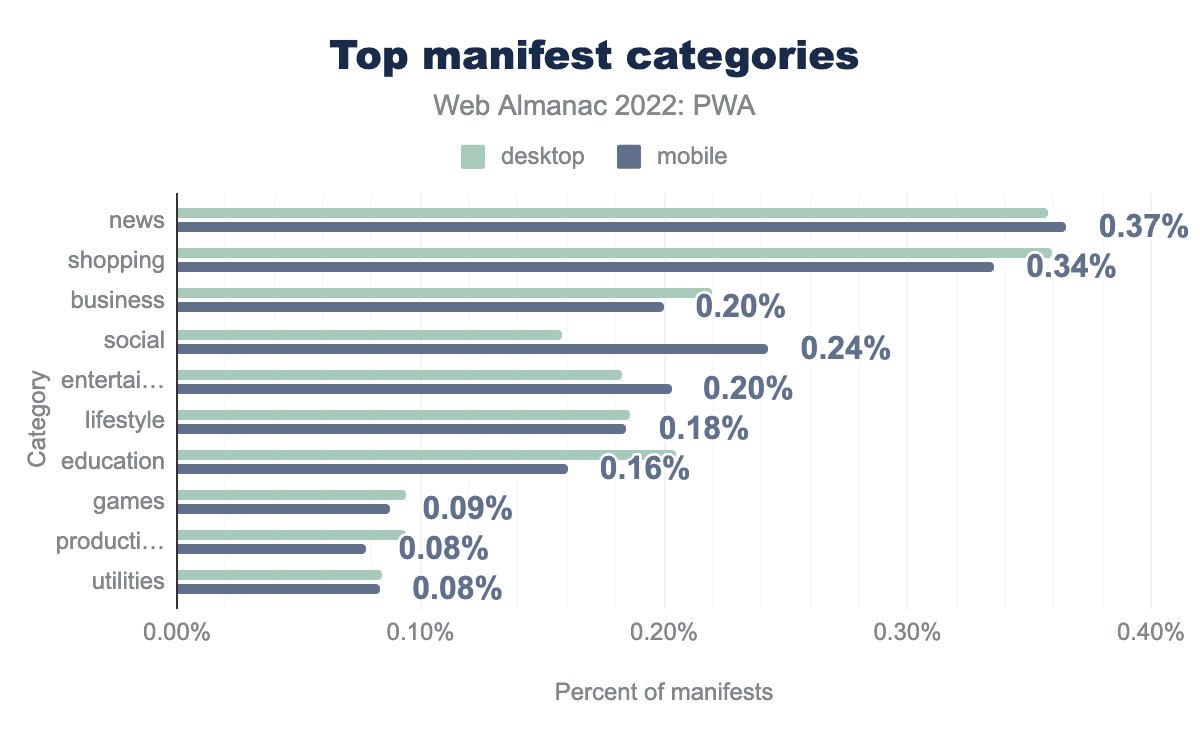 The top categories for both websites and PWAs remain the same, yet each is slightly different. Top categories are shopping, news, and business.