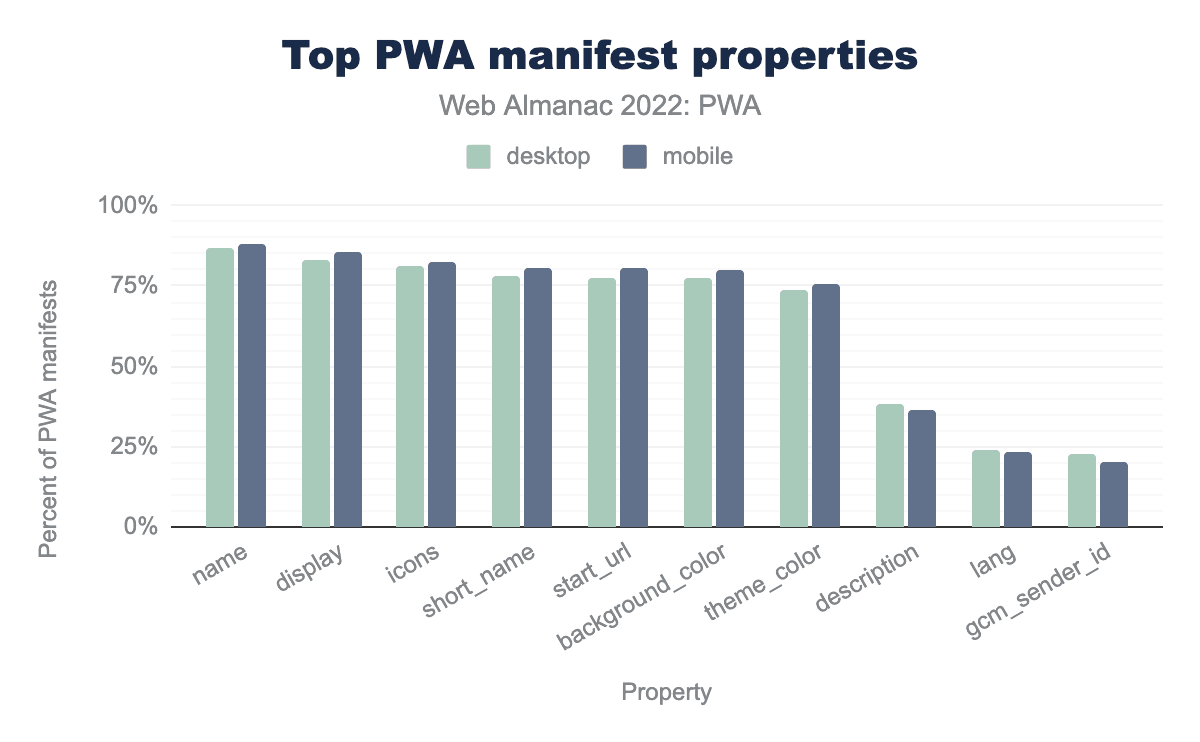 • description: This property exists in 36% of desktop and 34% of mobile web app manifests. The description is important since it explains what the application does. It’s commonly used to provide information about the app for a store. Currently around a third of installable PWAs would offer this information.