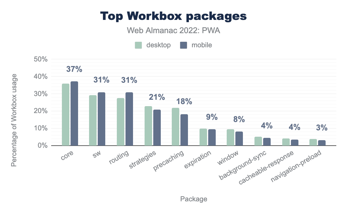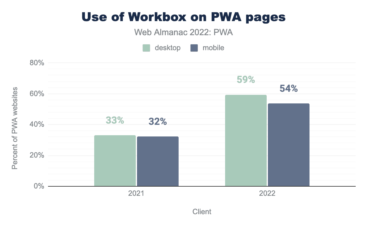 Compared with last year we see a big spike in Workbox usage. Last year its usage on mobile was 33% compared to 54% this year, and almost 60% of desktop PWAs use Workbox in some capacity.