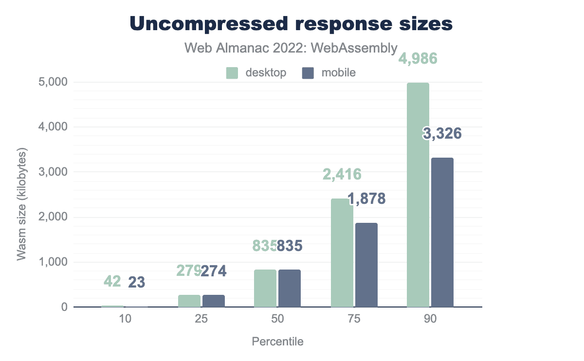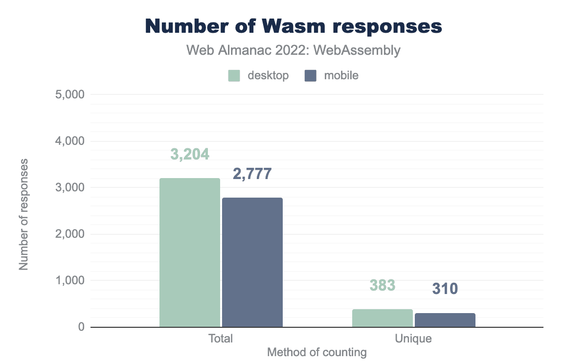 We found slightly fewer (-13%) WebAssembly modules served to mobile browsers. This isn’t a reflection on the WebAssembly capabilities of mobile browsers, which generally have excellent support. Rather, it is likely due to the standard practice of progressive enhancement, where in these cases the more advanced features that require WebAssembly are not supported for mobile users.