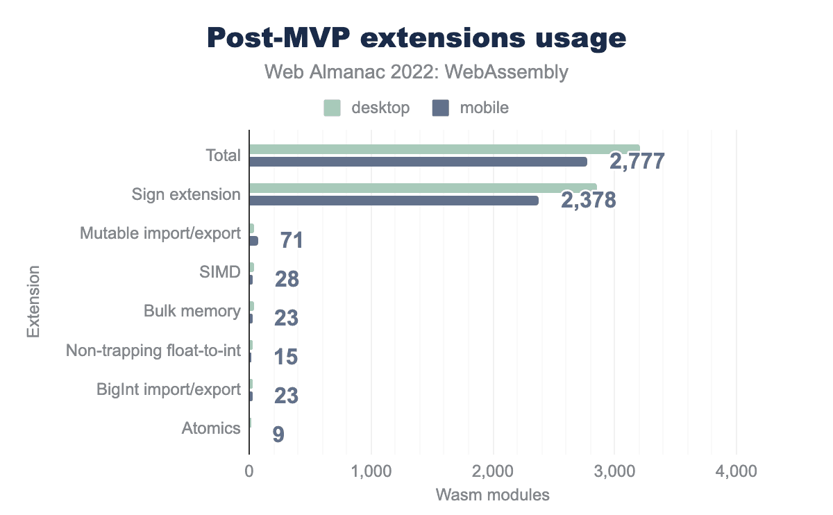 We looked at the Post-MVP features that are being used, finding that sign extension (a relatively simple enhancement adding operators that allow you to extend integer values to a greater bit-depth), was by far the most frequently used. This doesn’t represent a significant difference to the result found in last year’s analysis.