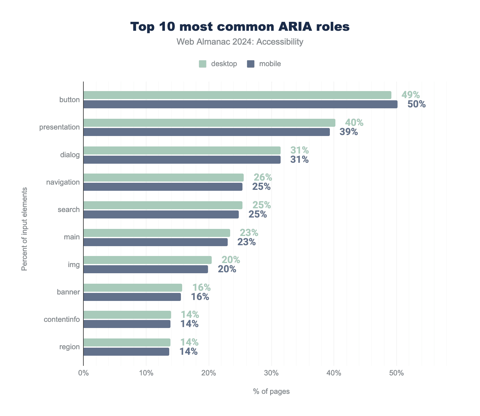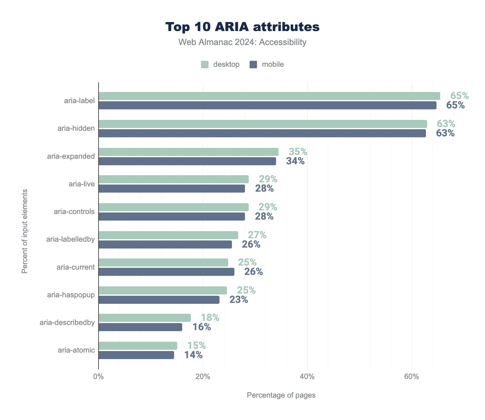 Our analysis shows that 63% of mobile websites and 64% of desktop websites utilize tabindex (up from 60% and 62% respectively). This attribute serves several purposes, which can affect accessibility: