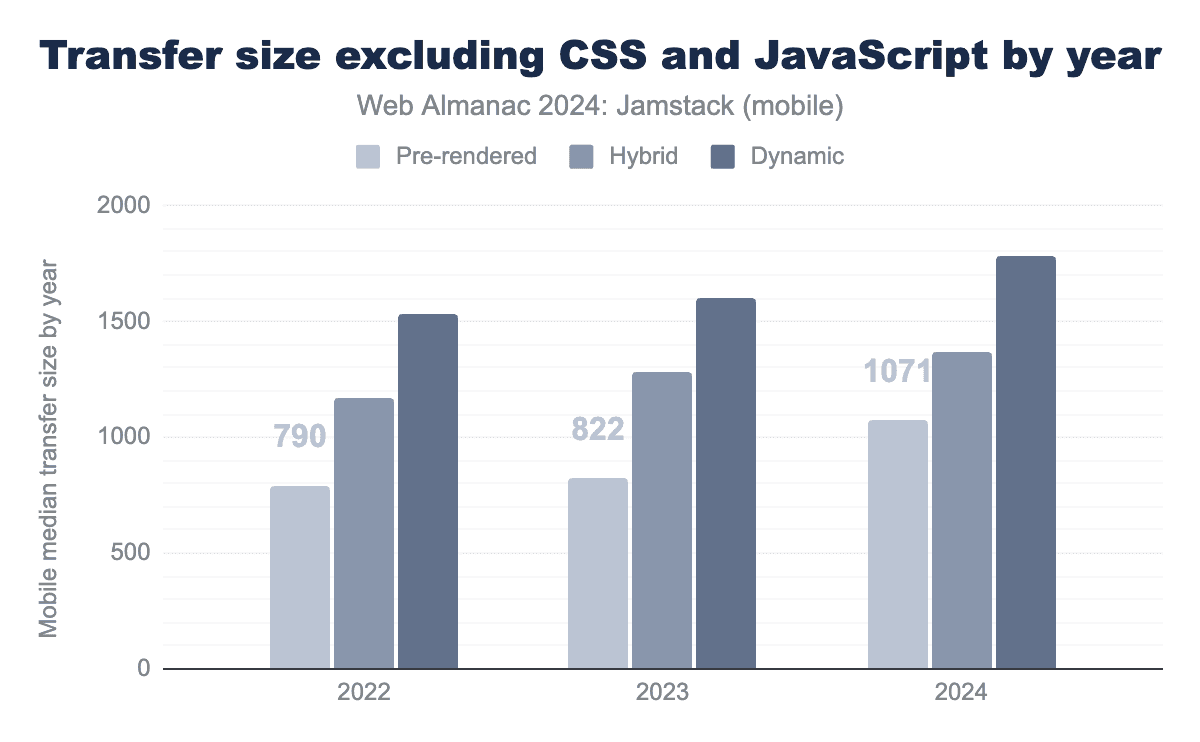 The total transfer of JavaScript offers one of the most interesting insights with a sharp increase in JavaScript size for Hybrid sites, surpassing that of the Dynamic category in 2024.