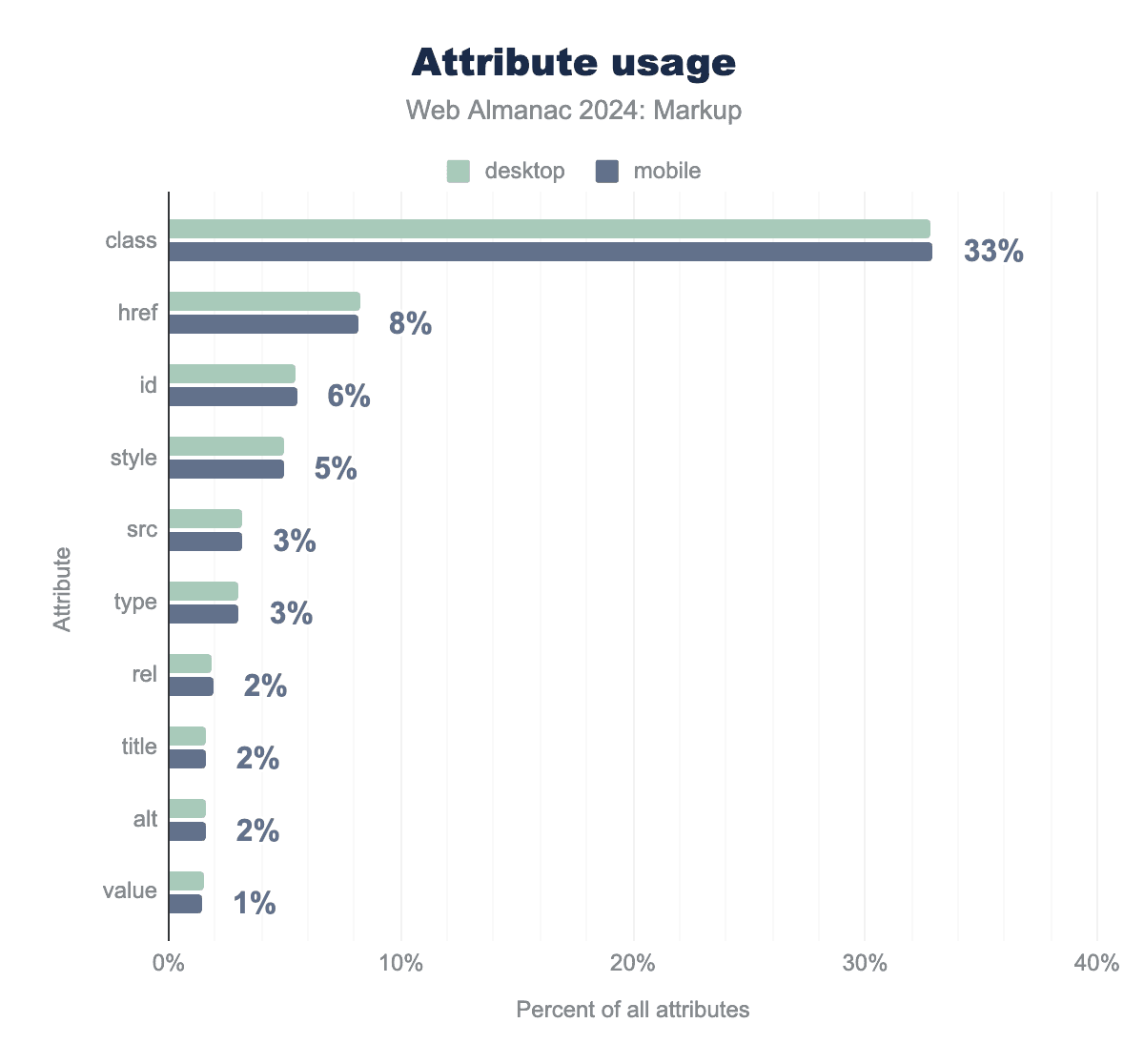 For another year, the most used attribute by far is class, with 48 billion occurrences in our mobile dataset, representing 33% of all attributes used.
