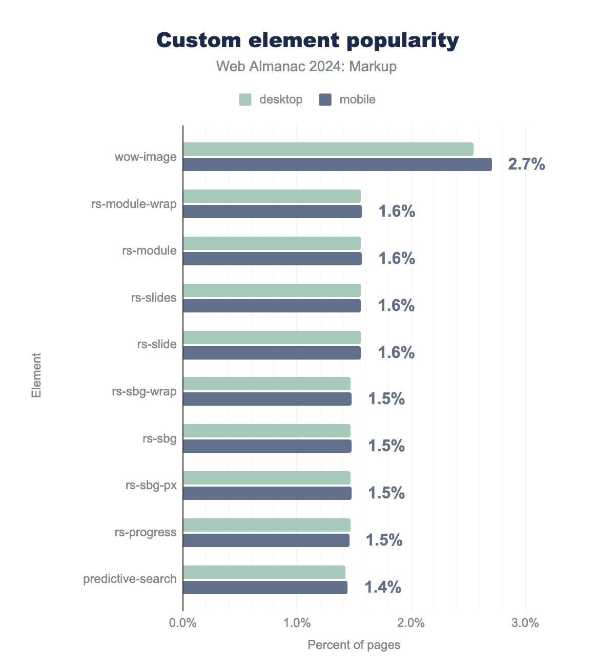 Custom elements, easily recognized by their hyphenated names, have once again made their mark in our analysis this year, showcasing their continued importance in extending HTML’s native functionality.