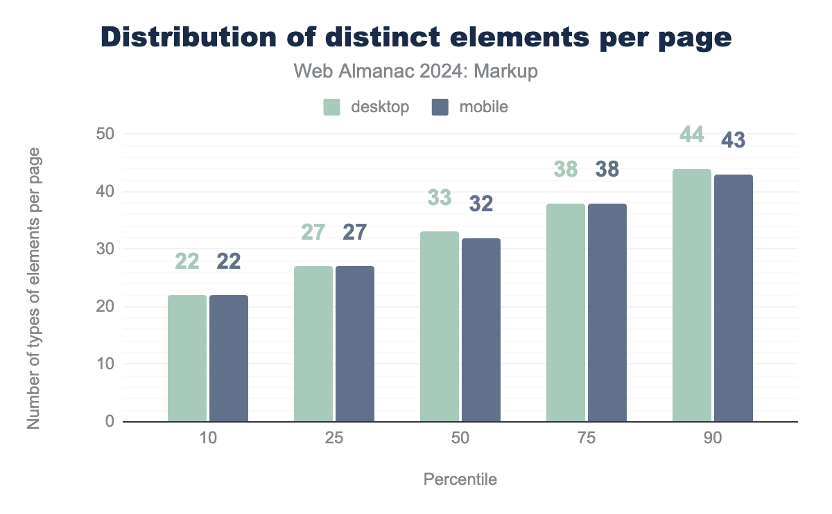 For both desktop and mobile pages, the data shows that the 10th percentile has 22 distinct elements, while the 90th percentile reaches 44 elements on desktop and 43 on mobile. The median number of distinct elements for mobile pages has remained consistent at 32 this year, the same as in 2022, and only slightly higher than the 31 observed in 2021.