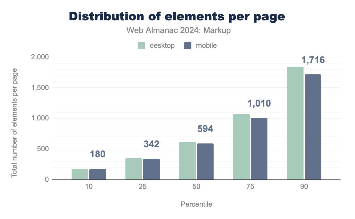 However, there are some differences when checking the distribution of elements per page. The data shows a slight decrease compared to 2022. For mobile, the median number of elements has dropped from 653 in 2022 to 594 in 2024. At the lower end, the 10th percentile for mobile shows a small drop from 192 to 180. The 90th percentile also shows a modest decrease, with mobile pages dropping from 1,832 to 1,716. This overall reduction suggests that pages are becoming slightly leaner in terms of the number of HTML elements used.