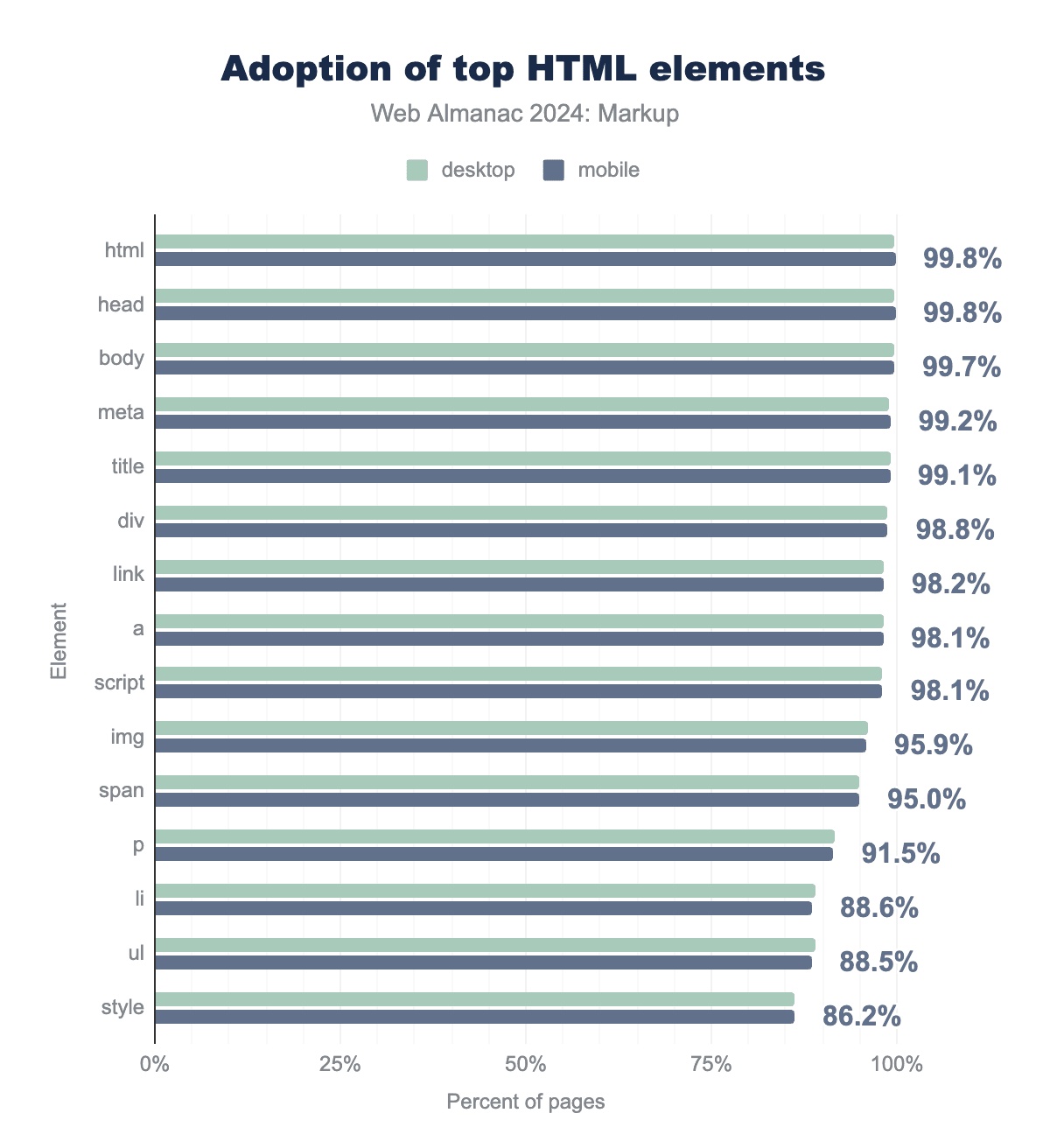 The adoption of top HTML elements across both desktop and mobile platforms remains consistently high, reflecting their foundational role in modern web development. The <html>, <head>, and <body> elements are nearly ubiquitous, appearing on over 99.7% of both desktop and mobile pages.