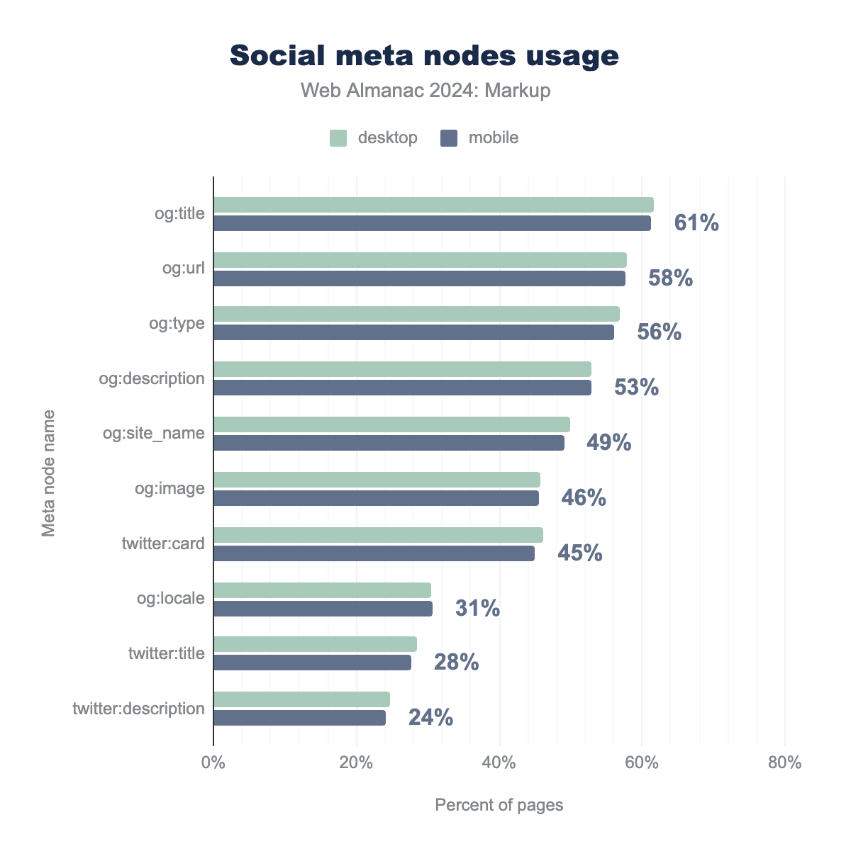 According to 2024 data, the most frequently used Open Graph meta tags are og:title (used by 61% of mobile pages) and og:url (58%). These tags define the title and canonical URL of the shared content, followed closely by og:type (56%) and og:description (53%), which offer insights into the content type and a brief summary. Twitter-specific meta tags like twitter:card (45%) and twitter:description (24%) are also still widely used, even though the platform is now branded as “X,” illustrating a lag in terminology updates across the platform.